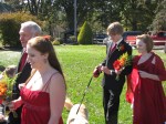 the music begins. I look to my left and I see Charlie leading Sarah, the Maid of Honor toward the arbor. Following are Kraig with his sister Kristy (my soon-to-be step children). I am blown away by how beautiful they look walking down the aisle. Kristy on one of Kraig’s arms and Samuel on the other.
