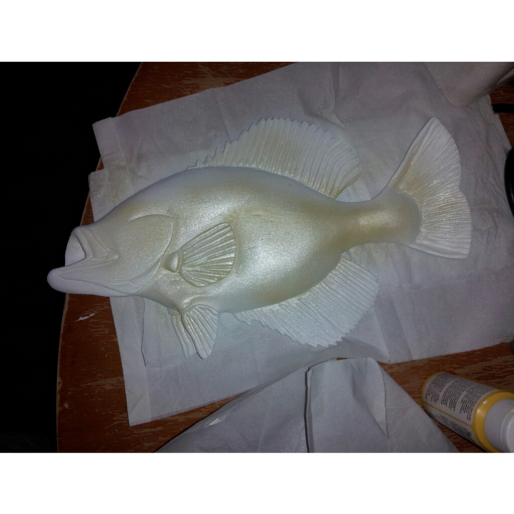 After the priming is completed, the airbrushing begins. Airbrushing allows me to add several coats of color in a layering method to add realistic depth to the fish skin. A special additive to the paint gives the impression of scales and increases the depth in the colors.